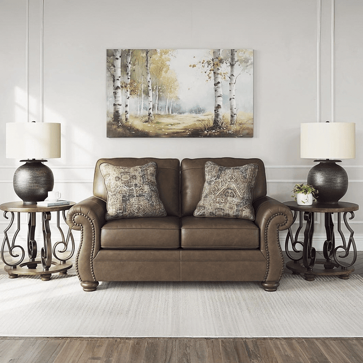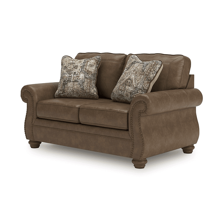 El Sofá Zlate 2 Cuerpos representa la esencia del confort clásico con un diseño que no pasa de moda. Su tapizado en cuerina tipo cuero envejecido y sus brazos enrollados con aplicaciones de tachuelas decorativas evocan la elegancia de los salones tradicionales europeos.